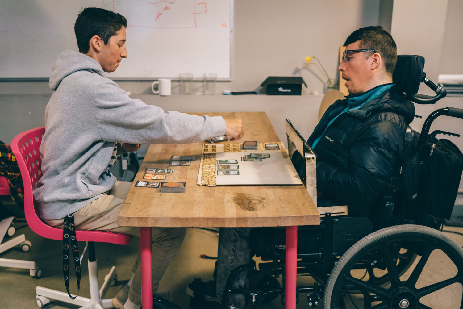 Amro AridaLee Cusack is a U/X designer and gamer who has spastic quadriplegic cerebral palsy. Lee’s main hobby is Magic the Gathering which he plays both online and in-person. Students designed systems and devices to amplify communication and motor abilities for daily activities and hobbies. Amongst other projects, students created a device to help him play Magic the Gathering with more independence from his caregiver, a fashionable bib to wear during meals, and a device to help him passively do physical therapy.